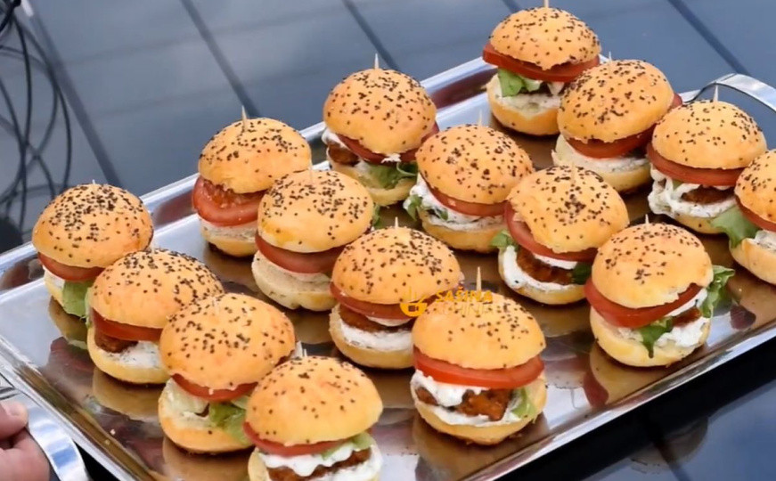 16. Sada su se peciva već ohladila. Razrezati na pola pa staviti malu žličicu tzatziki umaka, zatim pohovano meso, ponovo malo umaka a zatim se rasporedi odozgo zelena salata. Preko salate staviti krišku rajčice i zaklopiti sa pecivom i sve pričvrstiti čačkalicom