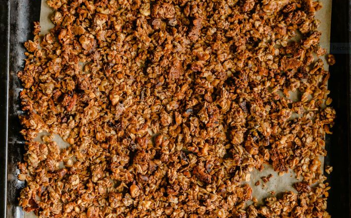 Zagrijte pećnicu na 150 °C. Tavu obložite papirom za pečenje. U zdjelu dodajte pahuljice, suncokretove sjemenke, cimet i đumbir. Sitno narežite orašaste plodove pa ih dodajte u zdjelu ostalim sastojcima i sve pomiješajte. Na laganoj vatri zagrijte maslac, javorov sirup i kokosovo ulje te miješajte dok se sve ne poveže. Pazite da ne zavri. Zagrijanu smjesu dodajte u zdjelu s ostalim sastojcima, prenosi TODAY.