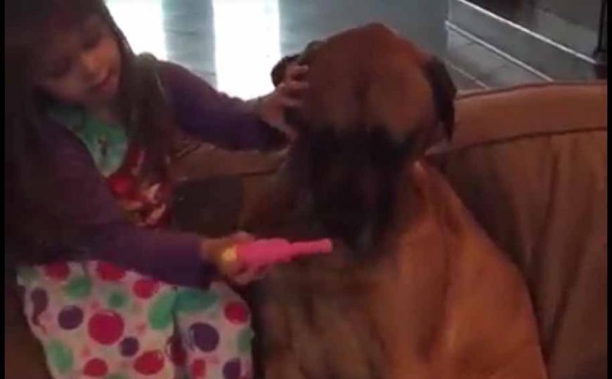 Pogledajte ovog divnog i poslušnog psa, koji mirno sjedi i dopušta djevojčici da mu pregleda uši, njušku...