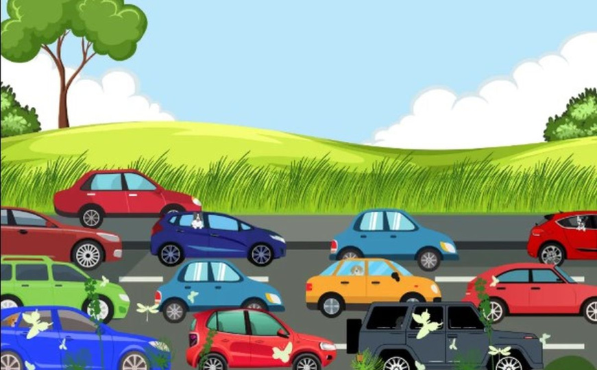 Riječ je o zanimljivoj mozgalici u kojoj je potrebno pronaći pet skrivenih pasa u prometnoj seoskoj sceni. Ilustracija prikazuje kolonu vozila zaustavljenih na cesti, okruženu prirodom, ali psi su vješto sakriveni i teško uočljivi na prvi pogled.