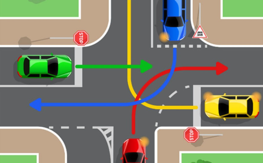 Na ilustraciji raskrsnice prikazana su četiri automobila različitih boja, a vozači su dobili jednostavno pitanje: kojim redoslijedom vozila treba da prođu kroz raskrsnicu?