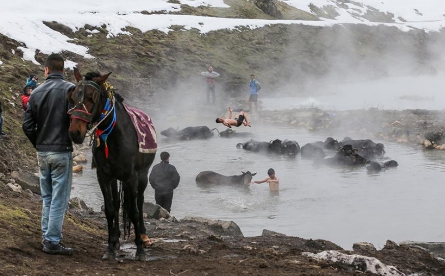 Putujući planinskim selom Budakli u turskoj provinciji Bitlisu fotoreporter Anadolu Agency (AA) zabilježio je prizor kupanja krda bivola, konja i lokalnih seoskih mladića na termalnim izvorima.