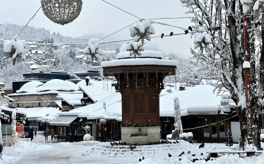 Sebilj na Baščaršiji, jedan od simbola grada, jutros je potpuno prekriven snježnim pokrivačem, okružen tišinom i rijetkim prolaznicima.