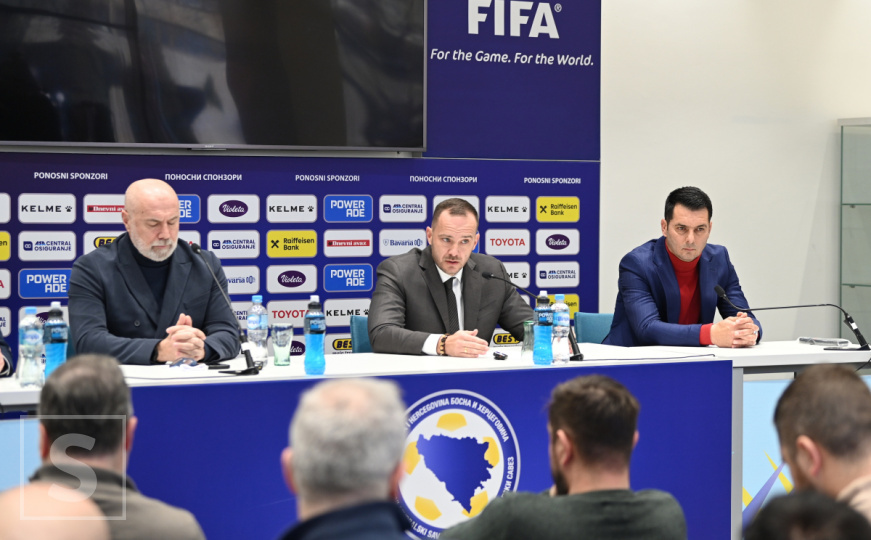Javnosti se obraćaju predsjednik N/FS BiH Vico Zeljković, selektor Sergej Barbarez i direktor reprezentacije Emir Spahić.