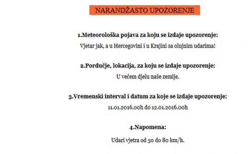 Federalni hidrometeorološki zavod Bosne i Hercegovine izdao je narandžasto upozorenje zbog jakog vjetra koji se očekuje u noći s ponedjeljka na utorak u većem dijelu zemlje.