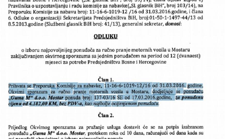 Ručno će tako automobile članova Predsjedništva prati firma „Guma M“ iz Mostara, a cijena ovog posla na godinu je vrtoglavih 4.182 KM bez PDV-a.