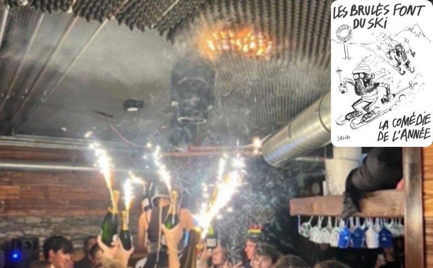 U petak, na dan žalosti, Charlie Hebdo je objavio karikaturu na kojoj su prikazana dva opečena skijaša uz natpis "Les brûlés font du ski" ("Opečeni idu na skijanje"), što je igra riječi na "Les Bronzés font du Ski" (Preplanuli idu na skijanje), naslov francuske filmske komedije iz 1979. godine. Na karikaturi se vidi znak "Crans-Montana", a u donjem desnom kutu piše "komedija godine".