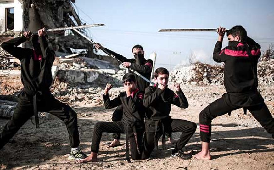 Mladi Palestinci slobodno vrijeme provode obučeni kao ninje, a s mačevima u rukama srušene zgrade koriste kao poligon za vježbanje i pokazivanje svog umijeća.