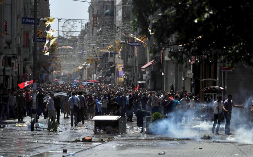 Turska policija je u nedjelju upotrijebila suzavac kako bi rastjerala nekoliko stotina ljudi na glavnom istambulskom trgu Taksimu koji protestirali protiv uvođenja policijskog sata i operacija vojno-policijskih snaga na većinski kurdskom jugoistoku zemlje.